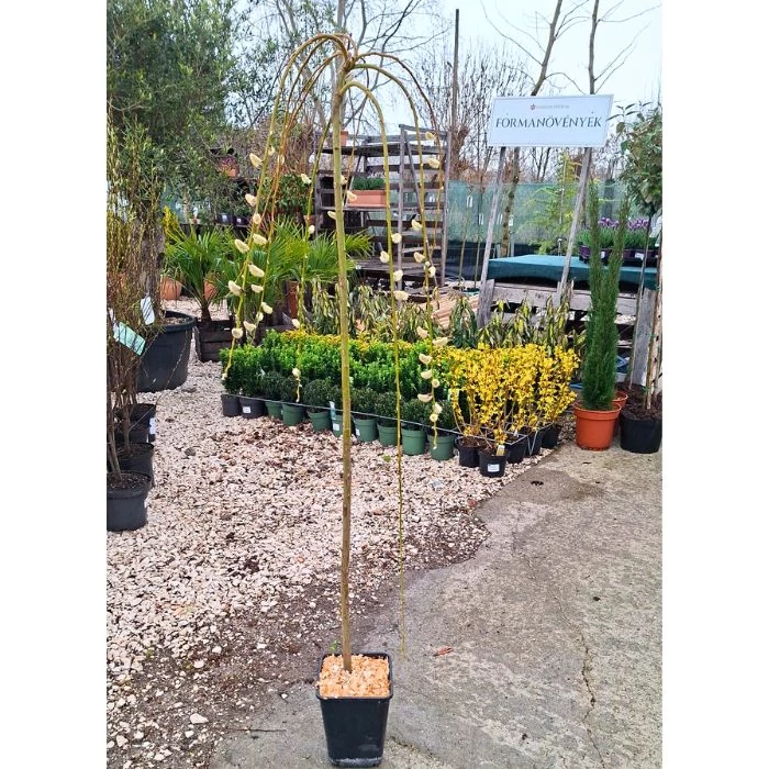 A Salix caprea Pendula, vagyis csüngő barkafűz egy különleges megjelenésű, törzsre oltott díszfa, amely elegánsan lehajló ágaival és korai virágzásával hívja fel magára a figyelmet. Tavasszal, még lombfakadás előtt jelennek meg puha, ezüstös barkái, amelyek a tél végét és a természet ébredését jelzik. Koronája az évek során szépen kiszélesedik, miközben hosszú, csüngő vesszői szökőkútszerű formát alkotnak. A virágzást követően megjelenő friss zöld levelek tovább fokozzák a növény díszítőértékét, így egész szezonban mutatós marad. A csüngő barkafűz napos vagy félárnyékos helyen fejlődik a legszebben, és kifejezetten kedveli a nyirkos, üde talajt. Vízigénye magasabb, ezért szárazabb időszakokban rendszeres öntözést igényel. Különösen jól mutat szoliterként vagy vízfelületek közelében, ahol természetes, lágy megjelenésével harmonikus kerti összképet teremt.